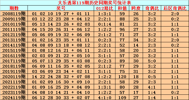 综上所述,大乐透第2025119期前区012路比参考0:2:3。