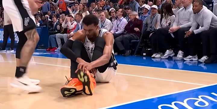 文班躺在地上捂着脚踝,队医跑过来检查了好一会儿才让他重新站起来。